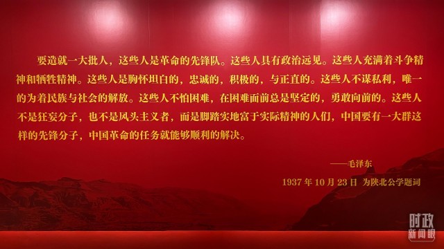 在总书记当天参观的校史展上,有一块展板专门展示了1937年毛泽东同志为中国人民大学的前身——陕北公学成立所作的题词。