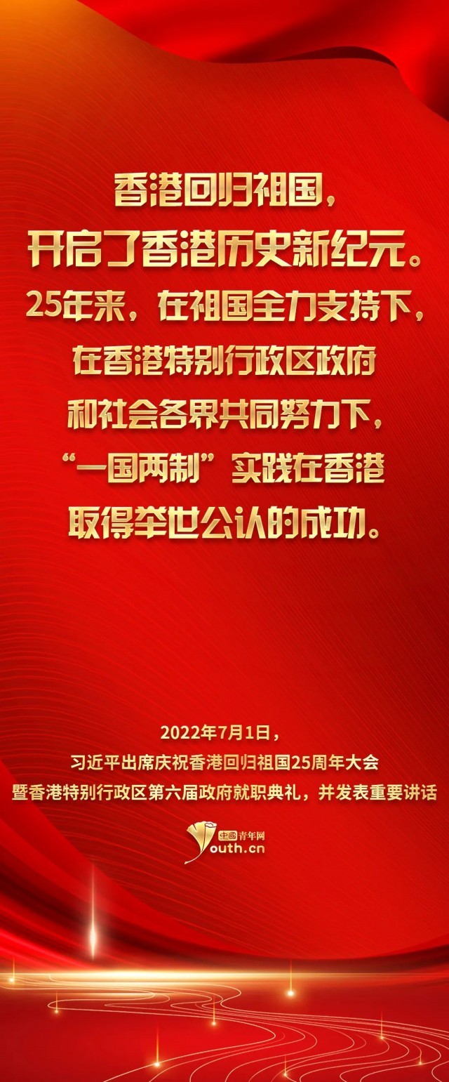 回归祖国的25年来,香港从胜利走向更大的胜利,从辉煌走向更高的辉煌。在党的领导下,在祖国的全力支持下,香港应时代之变迁,做时代之弄潮儿,发时代之先声。“一国两制”实践在香港取得举世公认的成功。