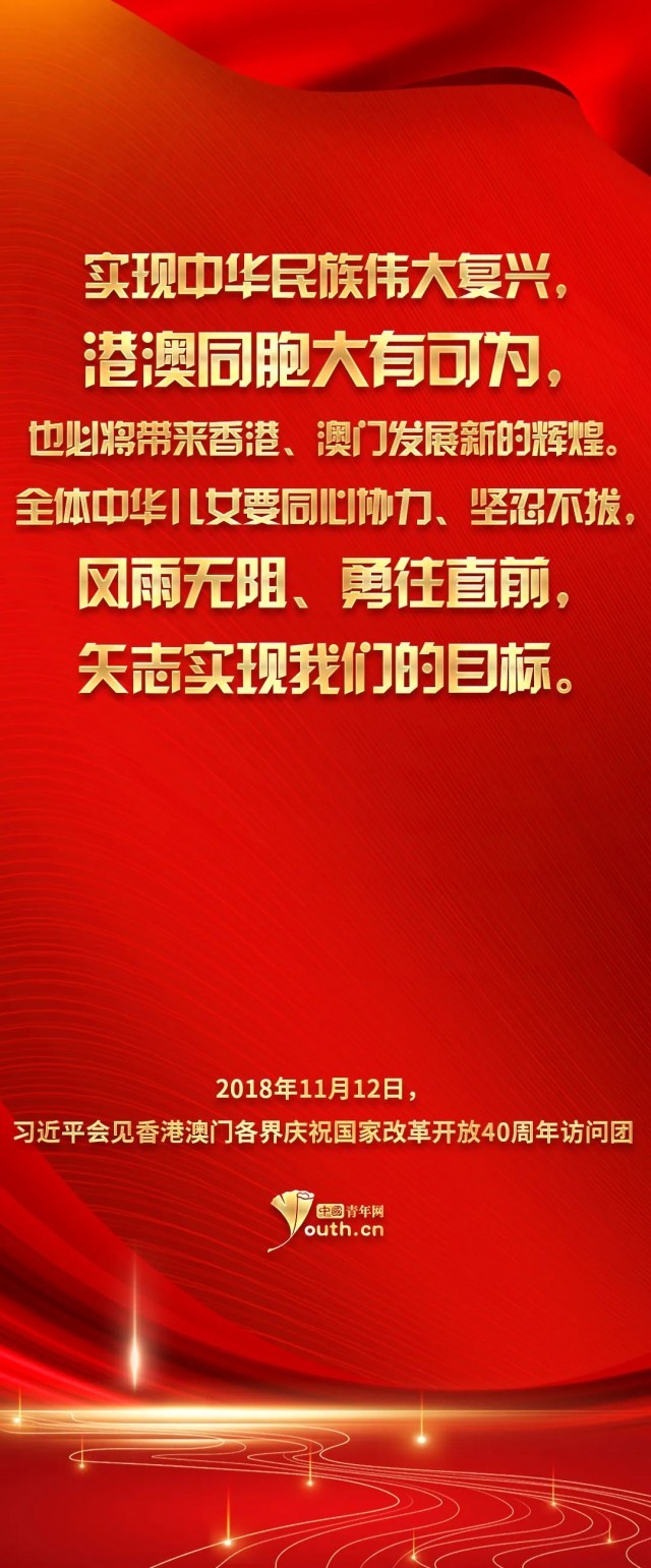 习近平总书记指出:“有伟大祖国的坚定支持,有‘一国两制’方针的坚实保障,在实现我国第二个百年奋斗目标的新征程上,香港一定能够创造更大辉煌,一定能够同祖国人民一道共享中华民族伟大复兴的荣光!”