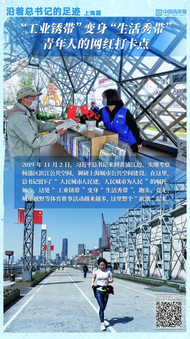 2019年11月2日,习近平总书记来到黄浦江边,实地考察杨浦区滨江公共空间,调研上海城市公共空间建设。在这里,总书记留下了“人民城市人民建,人民城市为人民”的嘱托。