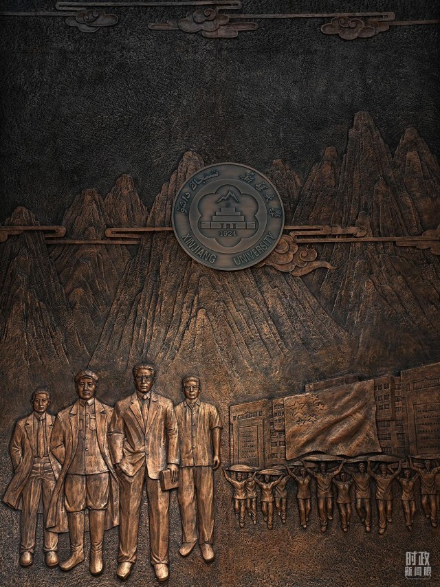 沿这条路前行,有一栋苏式黄色二层小楼,是新疆大学校史馆。校史馆序厅,展示着俞秀松、林基路等共产党人的浮雕铜像。“流金岁月”“红色传承”“坚守阵地”等展厅,陈列着见证新疆大学近百年奋斗历程的珍贵史料。