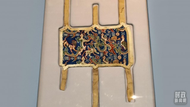 △“五星出东方利中国”锦护臂,民丰县尼雅遗址出土。(总台央视记者李晓周拍摄)