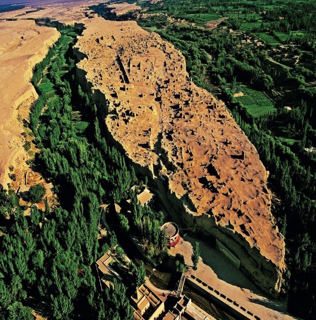 交河故城是当今世界上最大最古老、保存最完整的生土建筑城市,是一座在大地上直接雕刻出来的城市。与大多数城市不同,整个交河的建筑依自然地势,自上而下掏挖窑洞,开掘街巷,减地为墙。房子是挖出来的,大街深嵌地下六七米,临街厚厚的生土层充当高墙。这样独特的建筑方式,既能抵挡风沙日晒,也便于抵御外界侵袭。依靠得天独厚的自然条件,先民的勤劳智慧发挥得淋漓尽致。