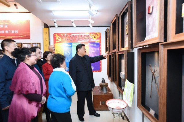 ↑2019年2月1日,习近平在北京市前门东区草厂四条“小院议事厅”同正在议事的居民亲切交谈。