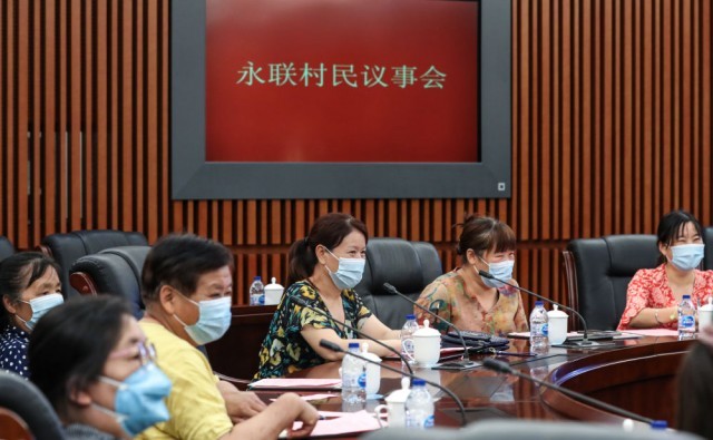 ↑江苏省张家港市永联村永全社区居民代表在村议事厅民主协议社区环境整治问题(2020年6月19日摄)。
