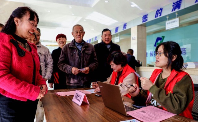 ↑浙江省长兴县吕山乡金村村级代办员(右一)为村民登记需代办事项。吕山乡金村在村便民服务中心专门设立代办窗口,为村民提供代办、代缴费等服务(2019年11月20日摄)。