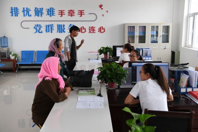 ↑村民在古浪县黄花滩生态移民区富民新村党群服务中心便民大厅办理业务。甘肃省武威市古浪县针对南部山区生产生活条件艰苦的实际情况,实施生态移民易地扶贫搬迁工程,建成12个移民新村,富民新村是其中之一(2019年8月22日摄)。