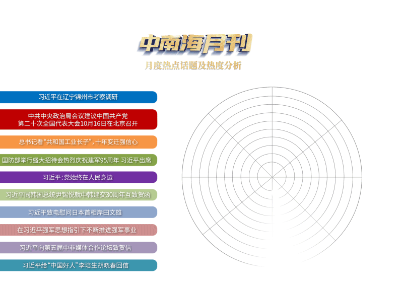 央视网“智闻”系统提取分析2022年8月全网时政新闻热点发现,中共中央政治局建议中国共产党第二十次全国代表大会10月16日在北京召开,习近平总书记在辽宁锦州、沈阳市考察调研的新闻热度很高。