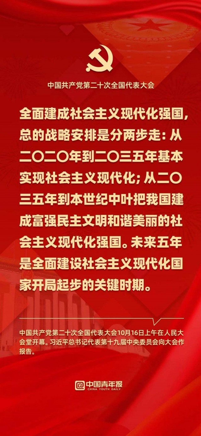 中国青年报客户端北京10月16日电(中青报·中青网记者 刘世昕)今天上午,在中国共产党第二十次全国代表大会开幕会上,习近平总书记在作报告时说,全面建成社会主义现代化强国,总的战略安排是分两步走:从二〇二〇年到二〇三五年基本实现社会主义现代化;从二〇三五年到本世纪中叶把我国建成富强民主文明和谐美丽的社会主义现代化强国。未来五年是全面建设社会主义现代化国家开局起步的关键时期。