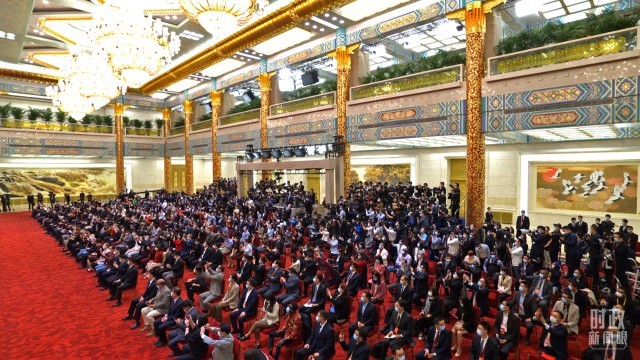 △10月22日,闭幕会后,部分二十大代表在人民大会堂前拍照留念。(图/视觉中国)