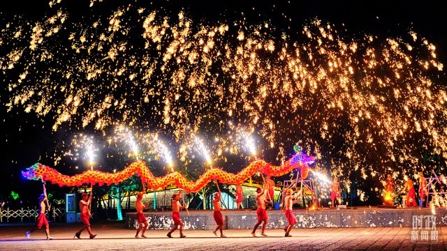 △山东枣庄,台儿庄古城表演队打铁花舞长龙,喜庆党的二十大。(图/视觉中国)