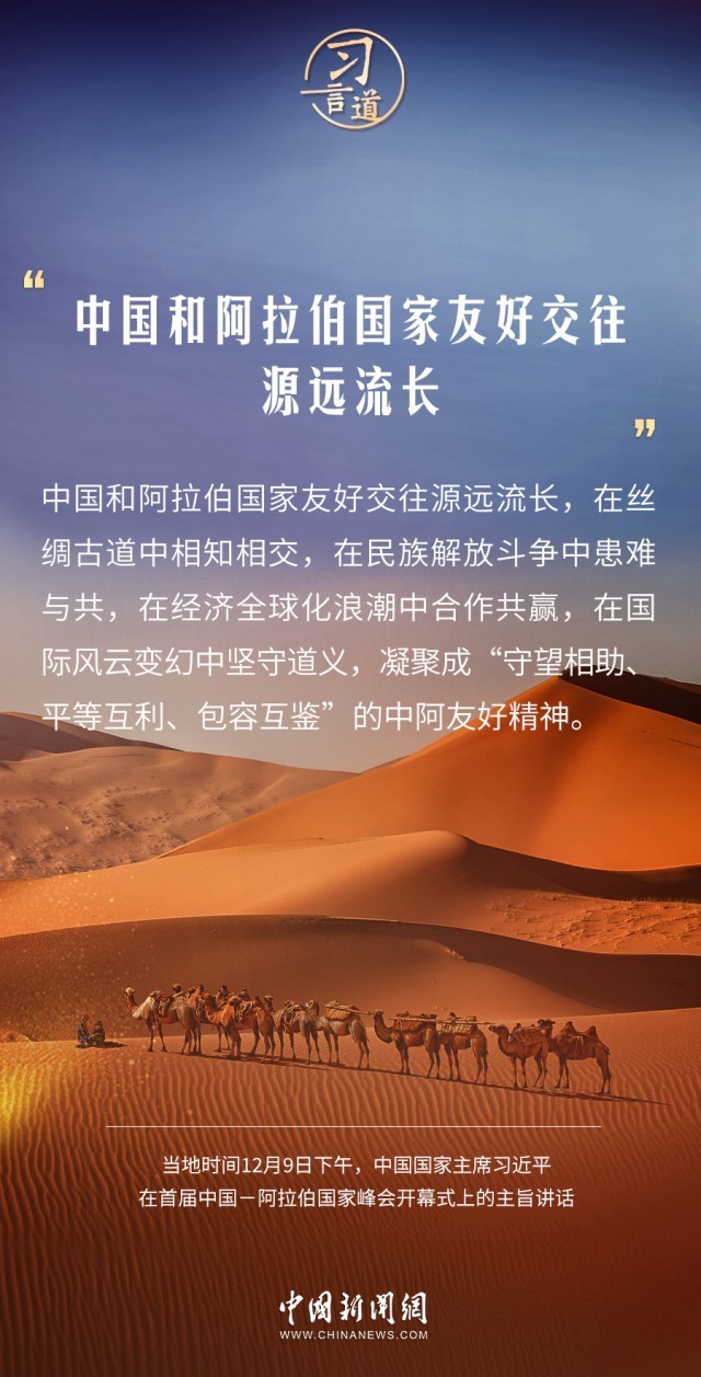当地时间12月9日下午,首届中国—阿拉伯国家峰会在沙特首都利雅得阿卜杜勒阿齐兹国王国际会议中心举行。中国国家主席习近平在主旨讲话中指出——