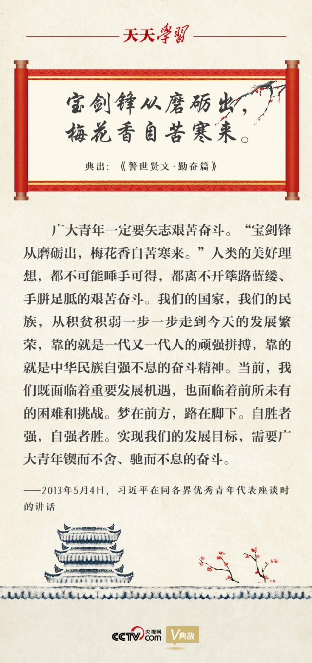 2013年5月4日,习近平总书记在同各界优秀青年代表座谈时,用“宝剑锋从磨砺出,梅花香自苦寒来”勉励广大青年练就过硬本领,矢志艰苦奋斗,用勤劳的双手、一流的业绩成就属于自己的人生精彩。以典喻理,寄意深远。