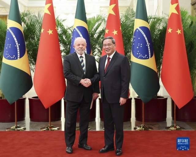 新华社北京4月14日电 国务院总理李强4月14日下午在人民大会堂会见来华进行国事访问的巴西总统卢拉。