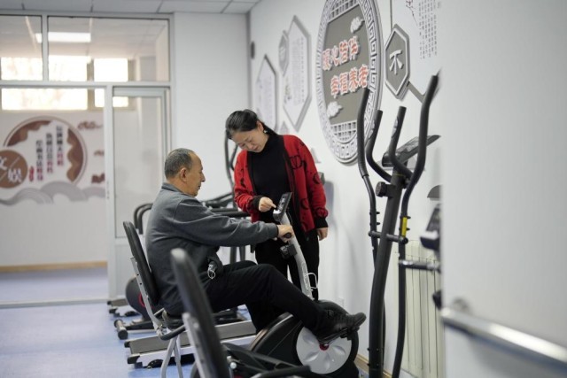 2023年4月16日,老年人在唐山市丰南区胥各庄镇一处社区养老服务中心内健身。新华社记者 牟宇 摄