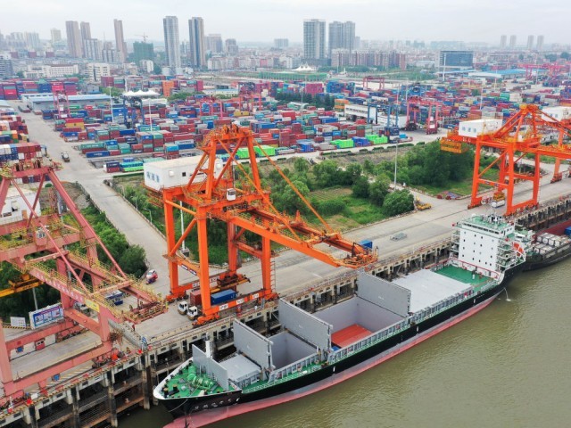 “华航汉亚2号”货轮停靠在武汉新港阳逻集装箱码头进行装箱作业(2020年5月9日摄,无人机照片)。新华社发(赵军 摄)