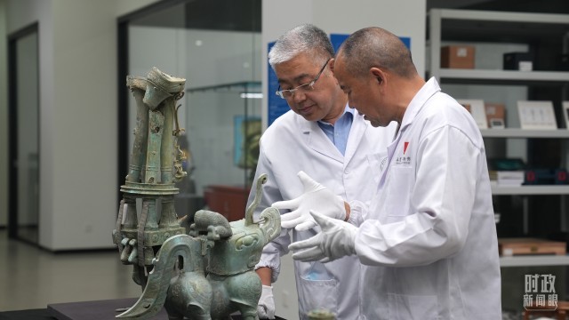 △三星堆文保专家正在就修复方案进行讨论。(总台央视记者刘琦拍摄)
