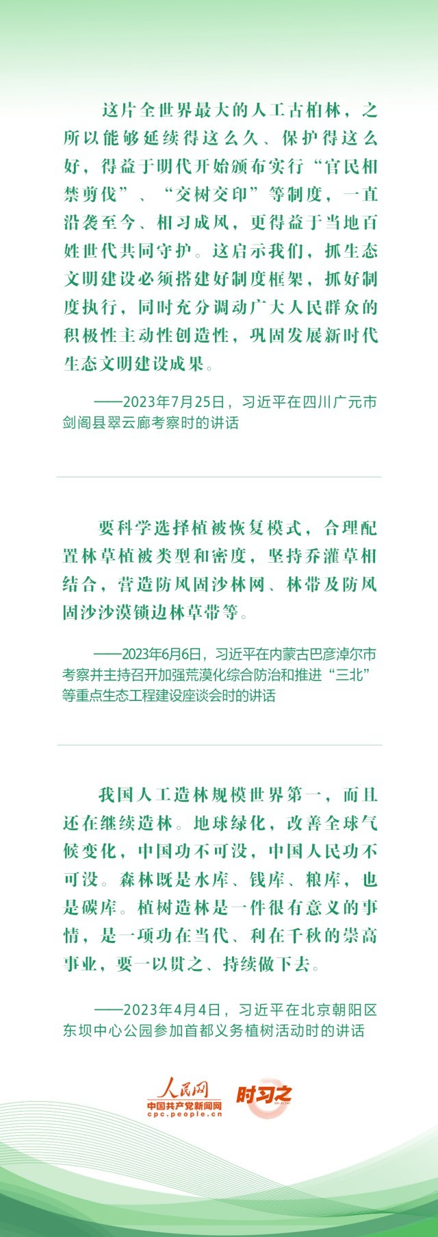 针对“三北”地区的林草植被种植工作,习近平指出,要科学选择植被恢复模式,合理配置林草植被类型和密度,坚持乔灌草相结合,营造防风固沙林网、林带及防风固沙沙漠锁边林草带等。