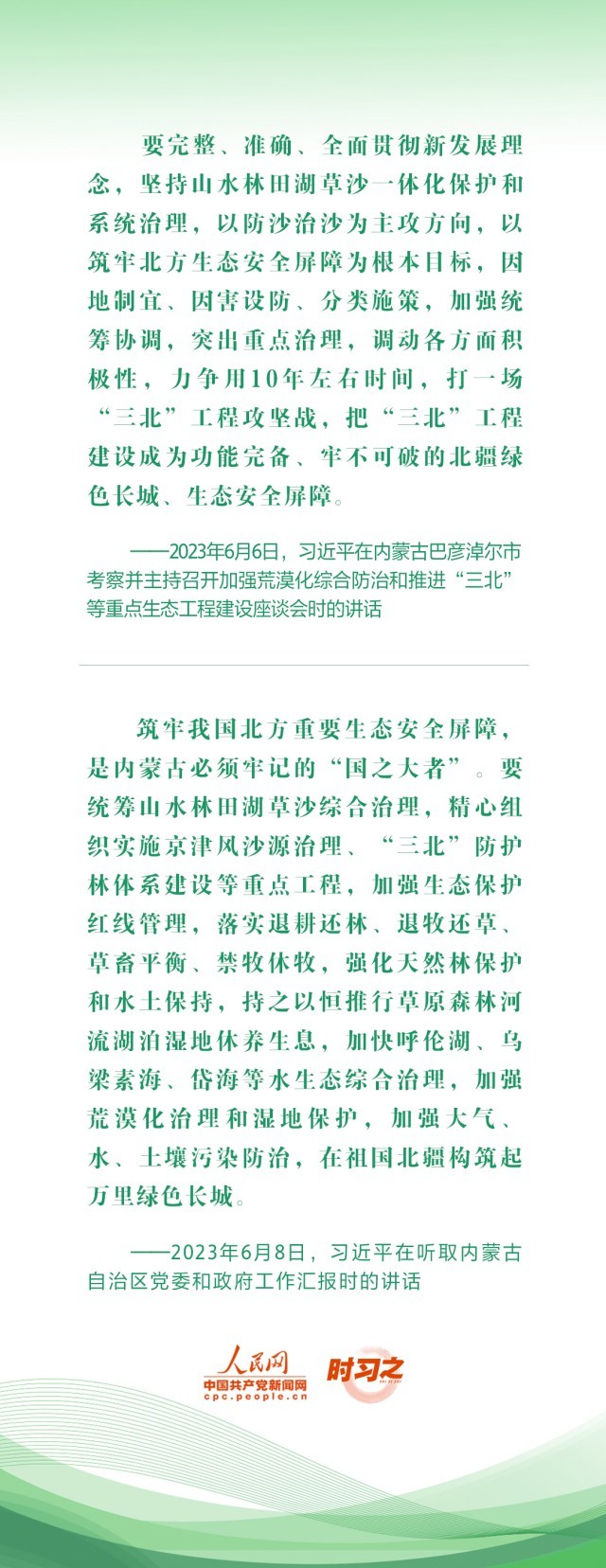 6月5日至6日,习近平来到内蒙古巴彦淖尔市考察,并主持召开加强荒漠化综合防治和推进“三北”等重点生态工程建设座谈会。