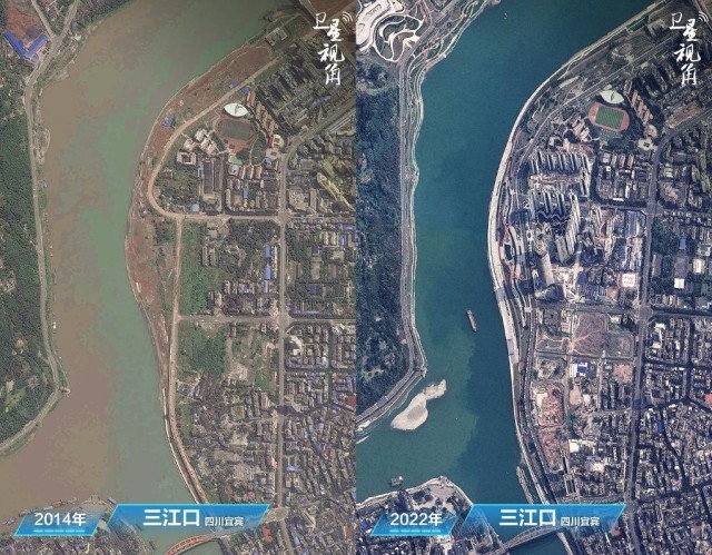 ↑2022年与2014年相比,四川宜宾三江口更绿了,岸线更美了。