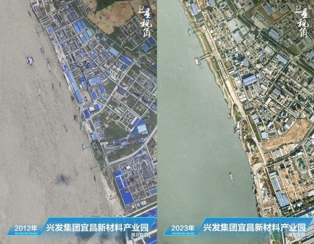 ↑2023年与2012年相比,兴发集团宜昌新材料产业园内,原来临江建设的生产设施已经搬迁和拆除。