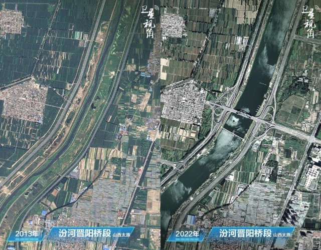 ↑2022年与2013年相比,通过综合治理和生态景观建设,汾河太原城区晋阳桥段水量更丰、风光更美。