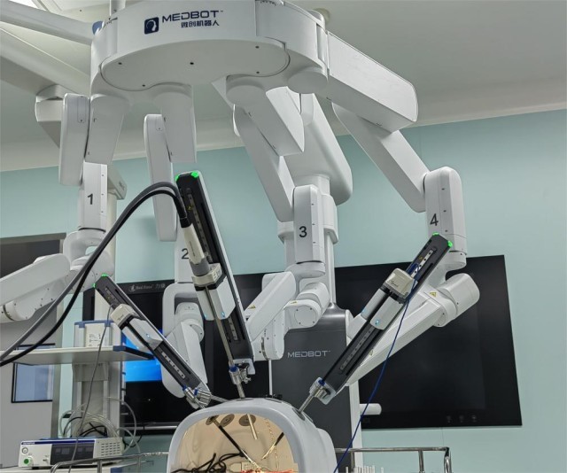 这是实施5G+AI超远程微创手术的四臂腔镜机器人。(受访者供图)