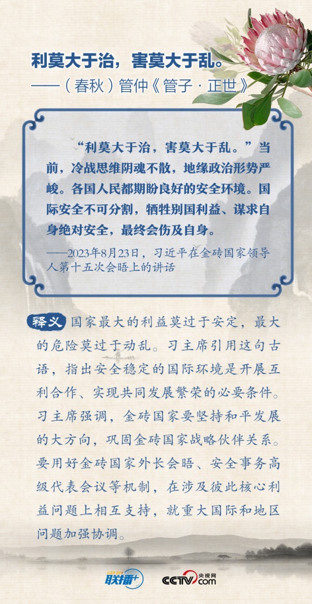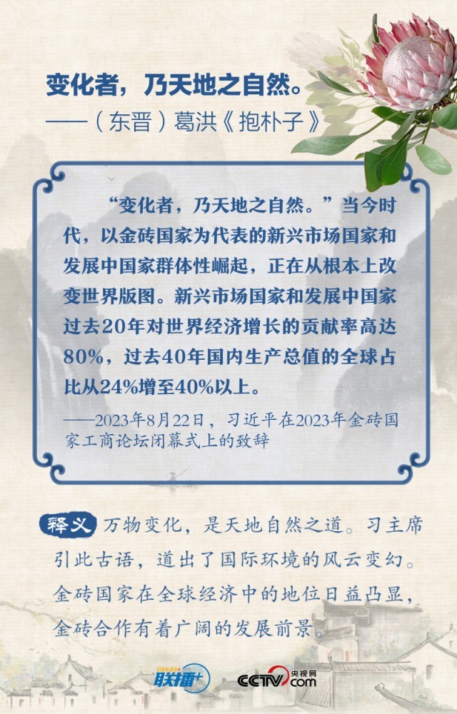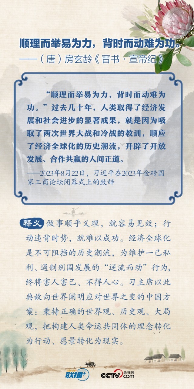 联播+ “顺理而举易为力,背时而动难为功”“变化者,乃天地之自然”“利莫大于治,害莫大于乱”…… 2023年的“金砖时间”里,习近平主席多次在讲话中引经据典,阐述金砖国家的合作与发展之道。央视网《联播+》特撷取习主席用典金句,与您一起学习。
