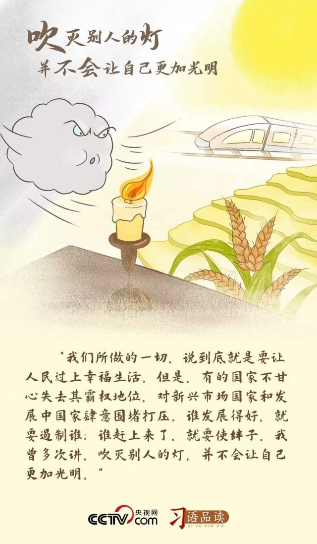 “吹灭别人的灯,并不会让自己更加光明”这句话,浅显易懂地阐明了一个朴素的道理,即通过打压别人,并不能使自己变得更加强大,同时也揭示了只有团结合作、共享机遇,才能走共赢之路,才能让发展成果惠及各国人民的普遍真理。