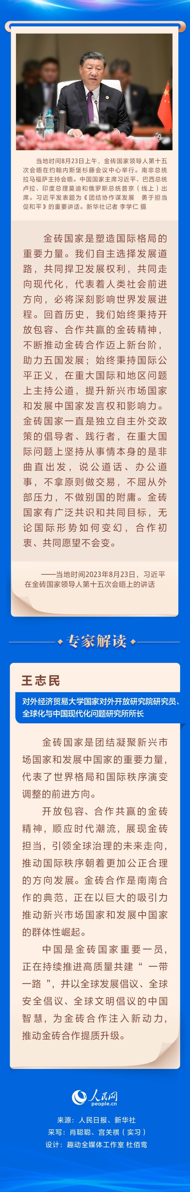 当地时间8月23日上午,金砖国家领导人第十五次会晤在约翰内斯堡杉藤会议中心举行。国家主席习近平发表题为《团结协作谋发展 勇于担当促和平》的重要讲话。人民网带您重温习近平主席讲话要点并邀请专家解读。