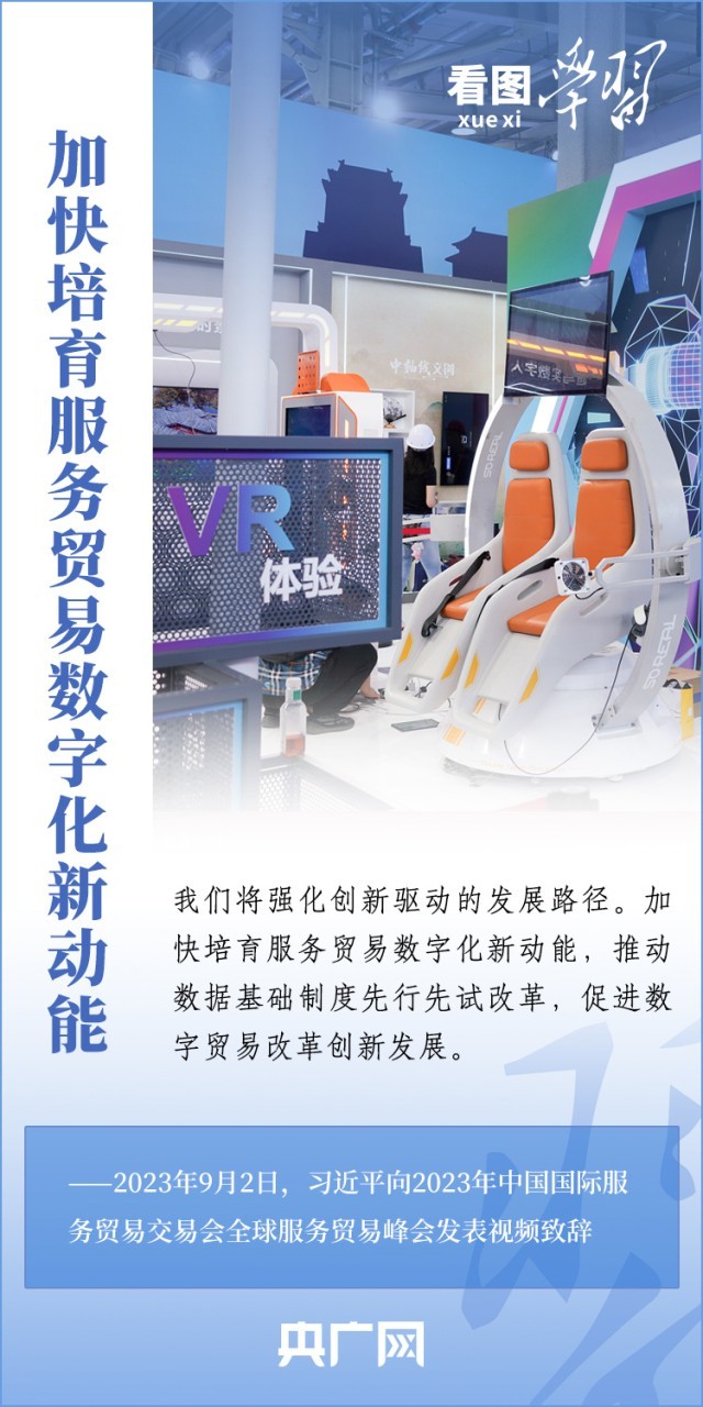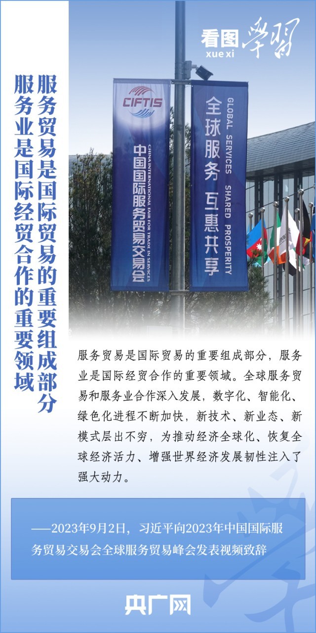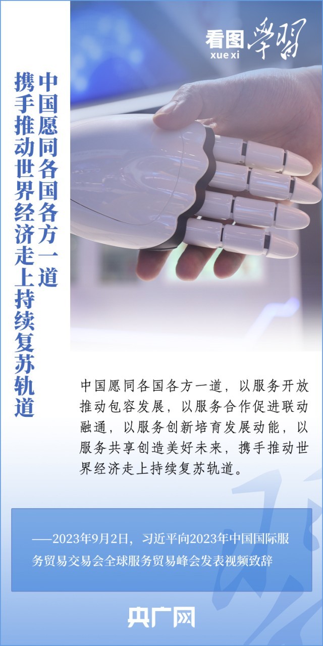 9月2日上午,以“开放引领发展 合作共赢未来”为主题的2023年中国国际服务贸易交易会在北京举行。国家主席习近平向2023年中国国际服务贸易交易会全球服务贸易峰会发表视频致辞表示,中国愿同各国各方一道,携手推动世界经济走上持续复苏轨道。一起来学习!