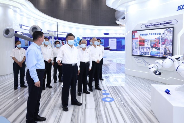 2022年8月17日下午,习近平在辽宁沈阳新松机器人自动化股份有限公司展厅,了解公司生产经营、自主创新情况。