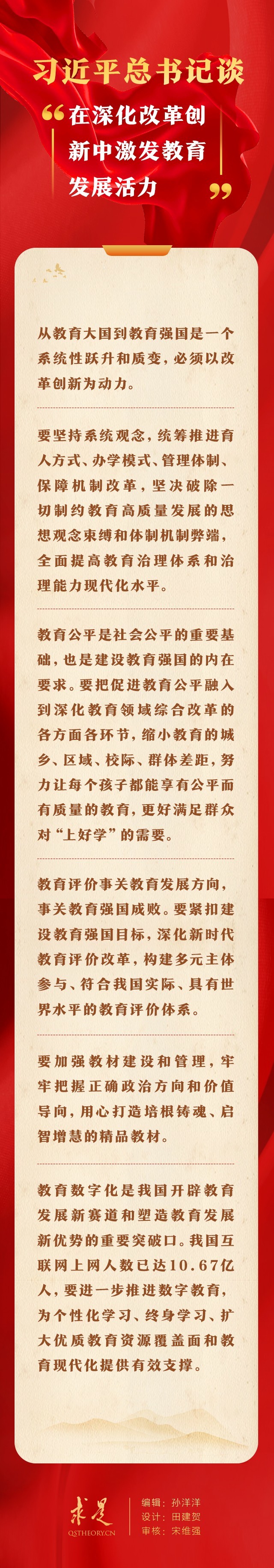 9月16日出版的第18期《求是》杂志刊发习近平总书记重要文章《扎实推动教育强国建设》。在这篇重要文章中,总书记从“培养担当民族复兴大任的时代新人”、“加快建设高质量教育体系”、“全面提升教育服务高质量发展的能力”、“在深化改革创新中激发教育发展活力”、“增强我国教育的国际影响力”、“培养高素质教师队伍”6个方面,对扎实推动教育强国建设提出明确要求。