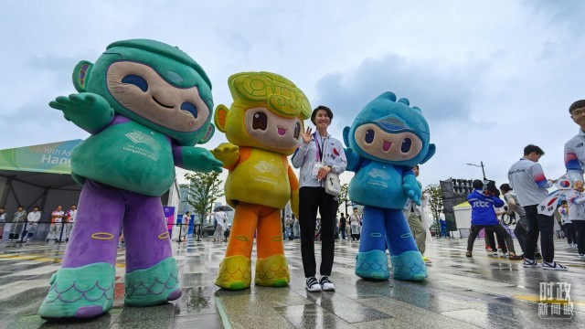 △亚运村为各代表团举行欢迎仪式,队员们纷纷与吉祥物“莲莲”、“琮琮”、“宸宸”合影。(总台央视记者陈伟奎拍摄)