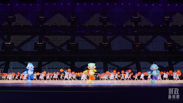 △开幕式文艺表演中的亚运会吉祥物。(总台央视记者魏帮军拍摄)