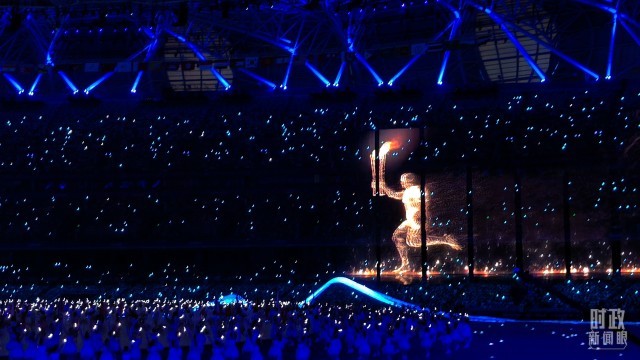 △“数字火炬手”入场,与现场火炬手共同点燃主火炬。(总台央视记者王子杭、总台国广记者李晋拍摄)
