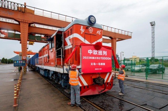 △2023年7月29日,满载110个标箱出口货物的X8020次中欧班列从浙江义乌西站准备启程。