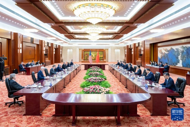 10月9日下午,全国人大常委会委员长赵乐际在北京人民大会堂会见美国国会参议院多数党领袖舒默率领的美国国会参议院两党代表团。新华社记者 翟健岚 摄
