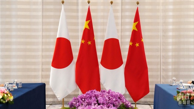 △会谈现场的中日两国国旗。(总台国广记者李晋拍摄)