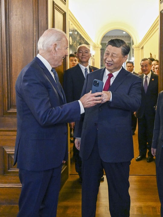 当地时间11月15日中午,美国旧金山郊外的斐洛里庄园,习近平主席结束同美国总统拜登的晤谈,出席拜登总统举行的宴会。拜登在手机上展示1985年习近平在担任正定县委书记时访问旧金山的一张照片。