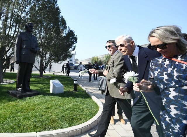 10月30日,在北京,飞虎队老兵哈里·莫耶(中)向陈纳德将军雕像献花。