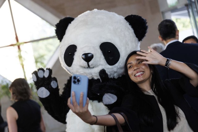 2022年8月24日,在美国华盛顿中国驻美国大使馆,来宾与大熊猫玩偶合影。
