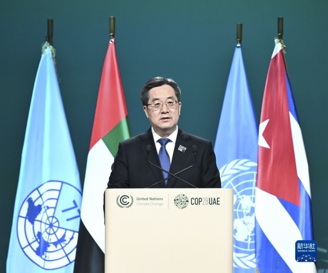 12月2日,习近平主席特别代表、中共中央政治局常委、国务院副总理丁薛祥出席在迪拜举行的“77国集团和中国”气候变化领导人峰会并发表致辞。新华社记者 燕雁 摄