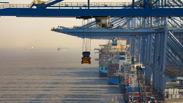 △上港集箱外高桥码头,巨型塔吊正在吊装集装箱货柜。(总台国广记者李晋拍摄)