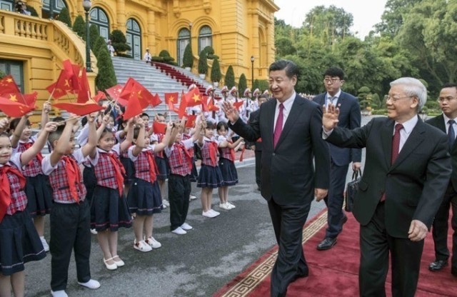 2017年11月12日,中共中央总书记、国家主席习近平在河内越共中央驻地同越共中央总书记阮富仲举行会谈。这是会谈前,阮富仲在主席府广场为习近平举行盛大欢迎仪式。 新华社记者 李涛 摄
