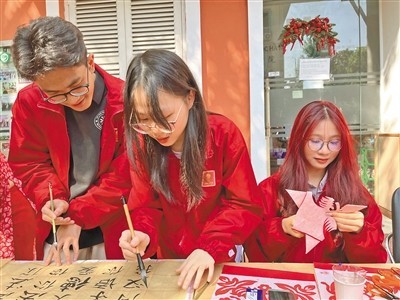 12月8日,在河内大学孔子学院举行的文化体验活动中,越南大学生体验中国书法和剪纸。本报记者 张远南摄