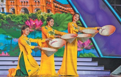 11月30日,2023年澜沧江·湄公河流域国家文化艺术节开幕式暨文艺晚会在云南景洪市举行。图为来自越南的艺术工作者在表演舞蹈《斗笠舞》。新华社记者 胡 超摄
