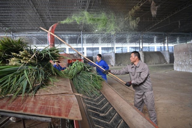 近日,在广西来宾市一家养牛场,工作人员正将甘蔗尾梢加工成饲料。 新华社记者 周华 摄