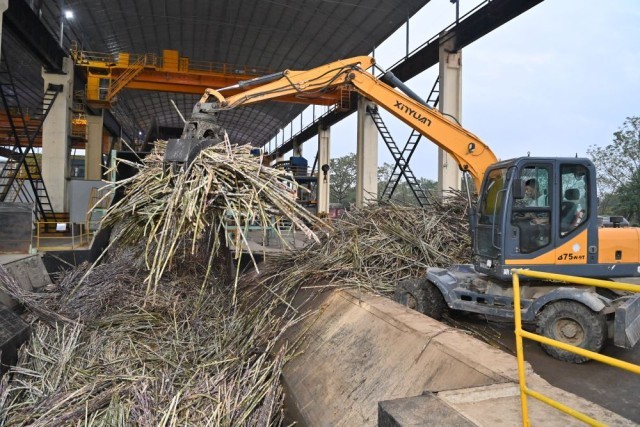 12月14日,在广西来宾东糖凤凰有限公司,员工操作机械将甘蔗投入传送带,准备送往压榨车间。