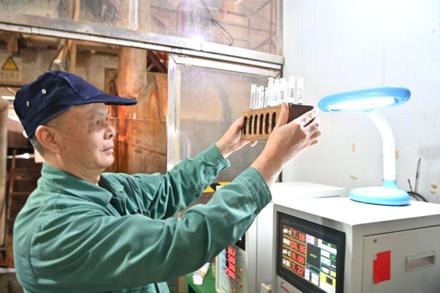 12月12日,广西来宾小平阳湘桂制糖有限公司的工作人员在检测糖浆样品。